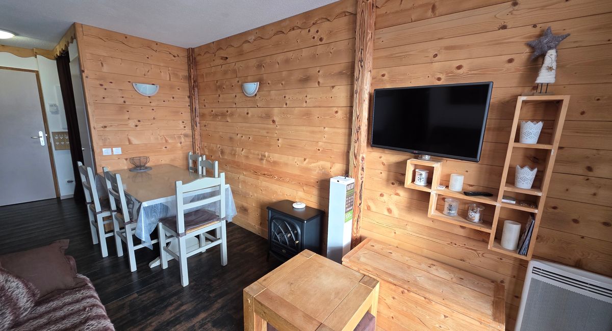 D'une superficie totale de 31m², l'espace comprend un salon confortable avec un canapé convertible, une kitchenette équipée d'équipements modernes tels qu'un micro-ondes, un lave-vaisselle et une machine à expresso, et une chambre avec un lit double (140cm). Des couchages supplémentaires incluent deux lits superposés dans le coin montagne. Le balcon exposé au sud offre une vue panoramique imprenable sur la vallée environnante.