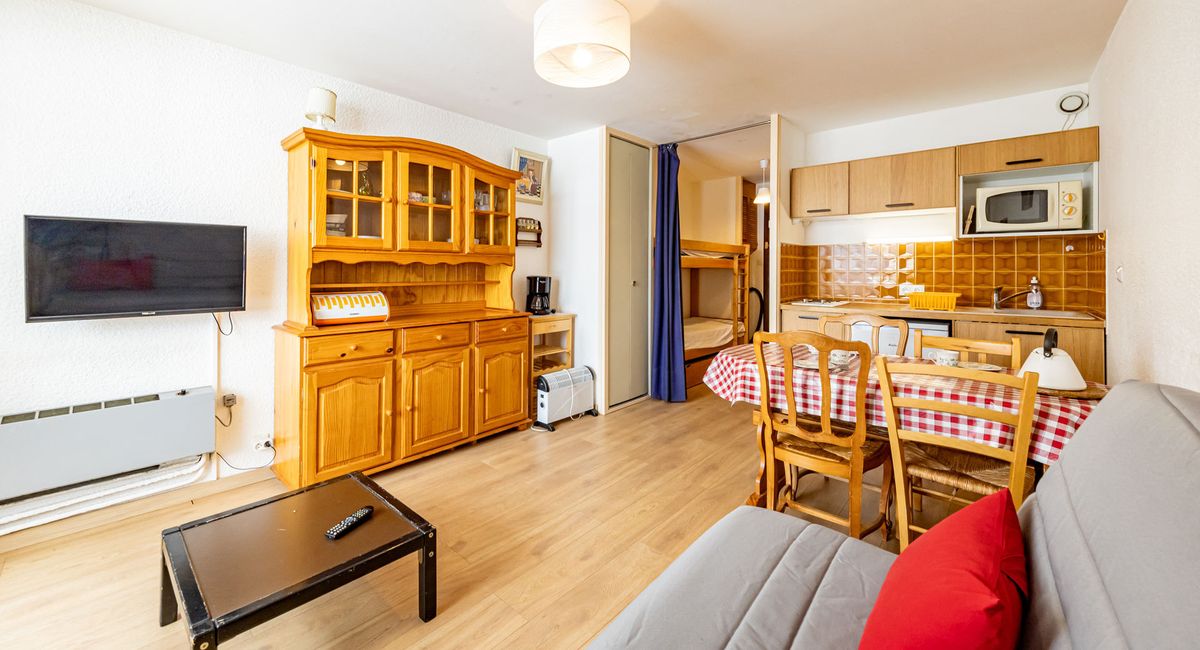 Pour votre confort, cet appartement est équipé d'un coin montagne avec un lit superposé (deux couchages de 90 cm), le séjour séparé d'un rideau, dispose d'un canapé convertible en 160 cm, ainsi qu'une télévision écran plat murale pour vos moments de détente.