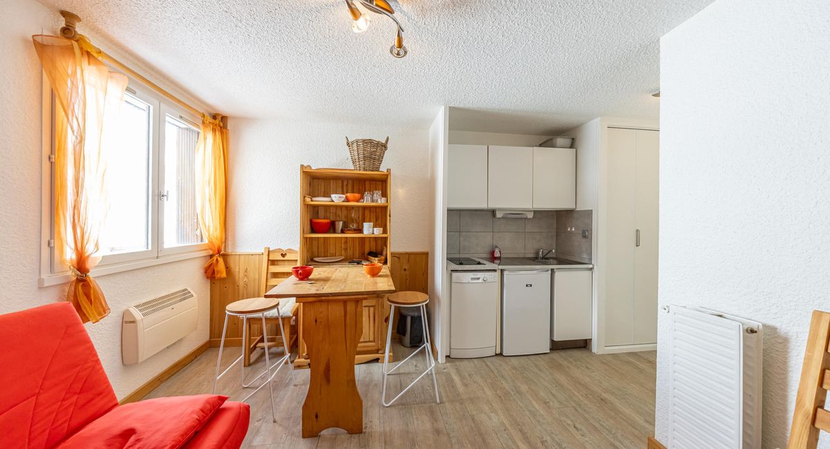 Located at the top of the resort in the Résidence Le Roc Rouge, this bright 16 m² studio is at the foot of the Mollaret chairlift and close to the shops.