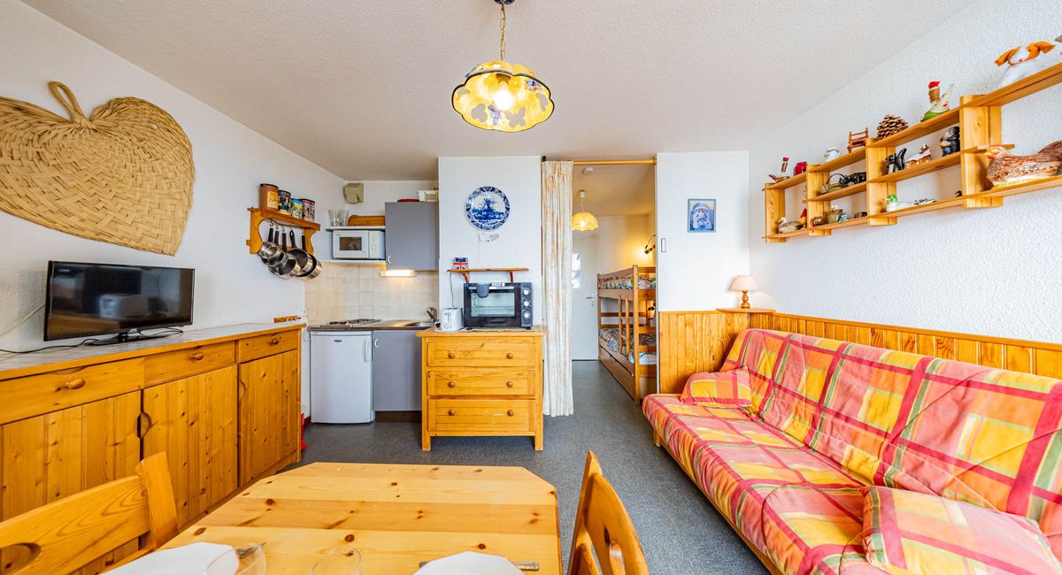 For your comfort, this studio is equipped with a mountain corner with a bunk bed (two 90 cm beds), separated from the living room by a curtain, a 140 cm sofa bed and a flat-screen TV for your moments of relaxation.