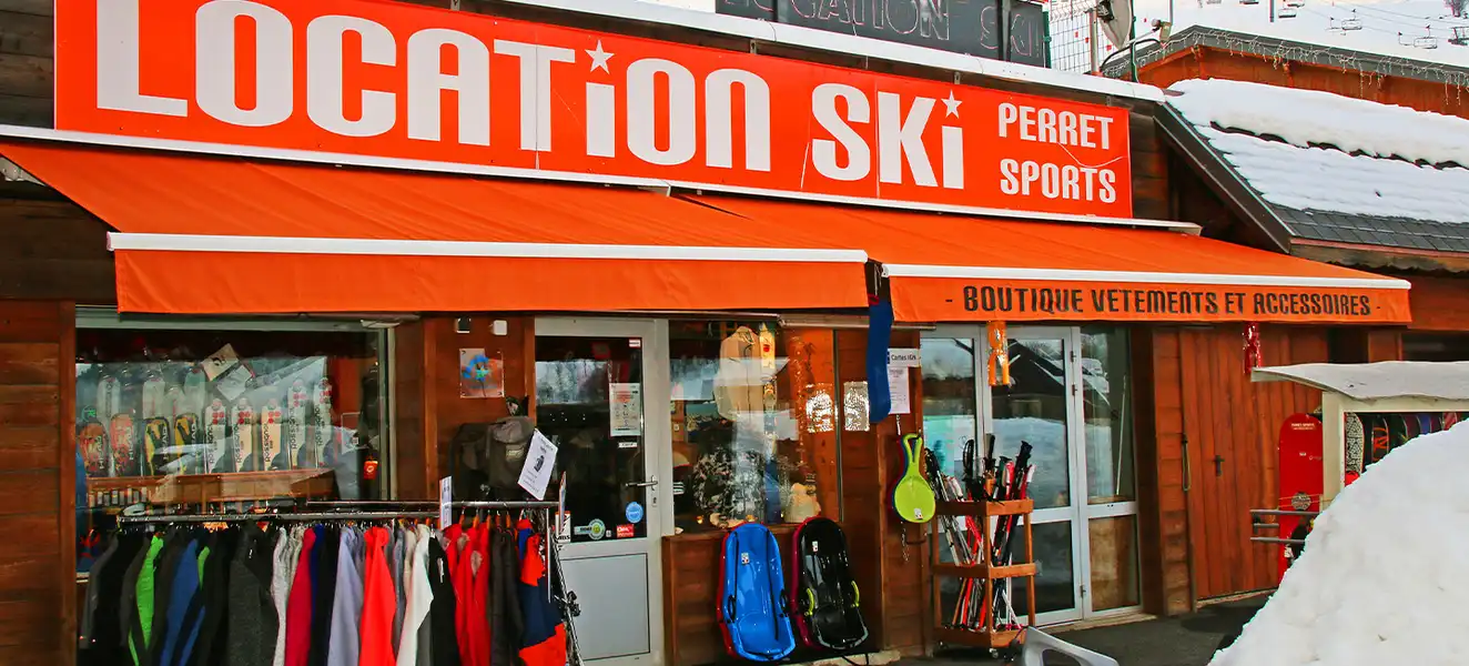 Le magasin PERRET SPORTS est idéalement situé aux départs des cours ESF, à coté du télésiège de la Lune bleu, de la Maison des Enfants et de l'Office du Tourisme.